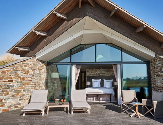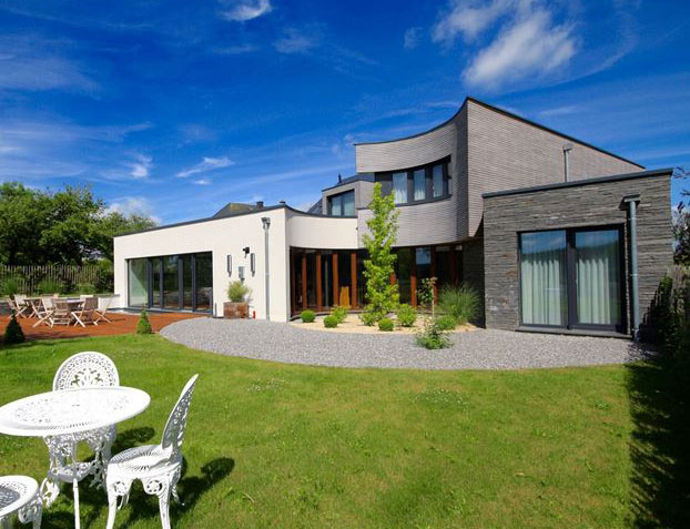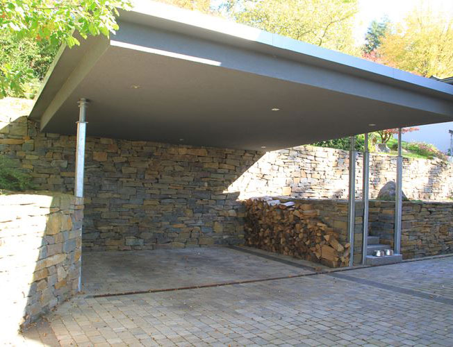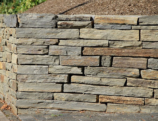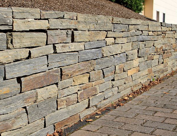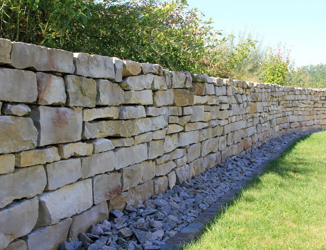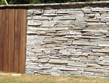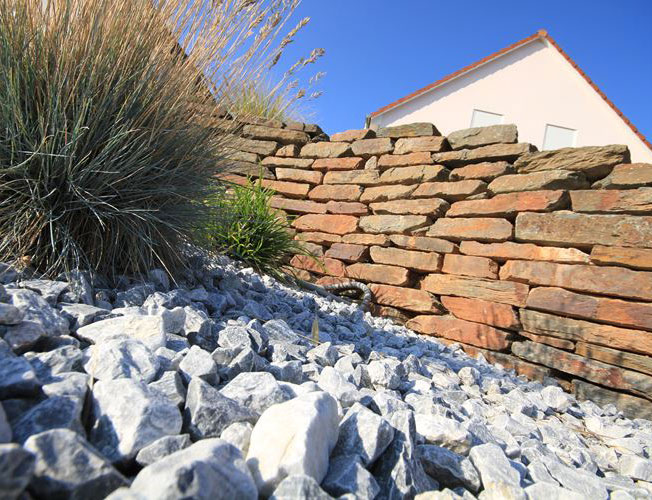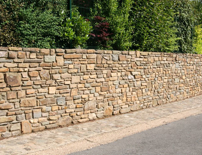 À l'extérieur, le moëllon construit et habille les murs de façade, murets et pîlastres. Il peut également être utilisé en soubassements de façade.