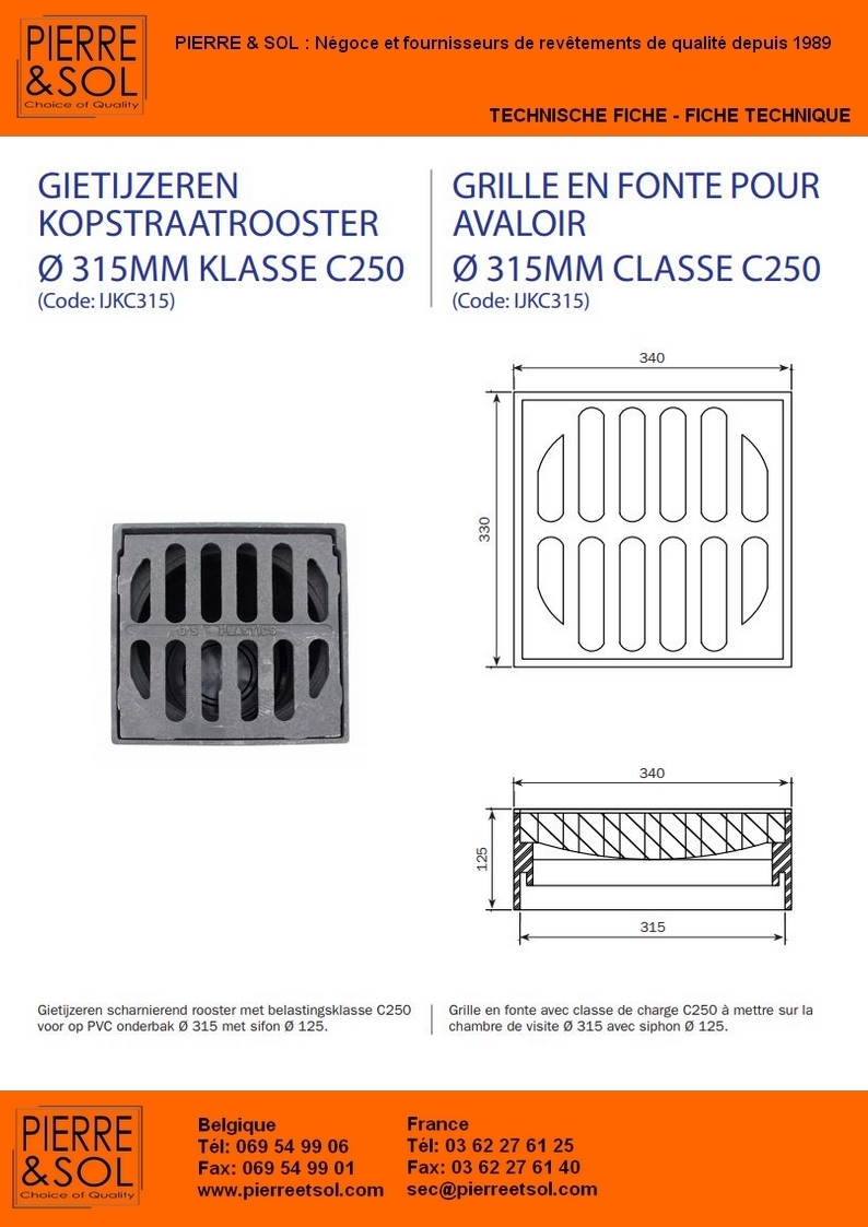| Cast iron avaloir for PVC Chamber | 300 x 300 mm | A 15 | €113.40 | €136.08 | DES IJKA250 | 9145386001706 | 1 Pièce(s) |
