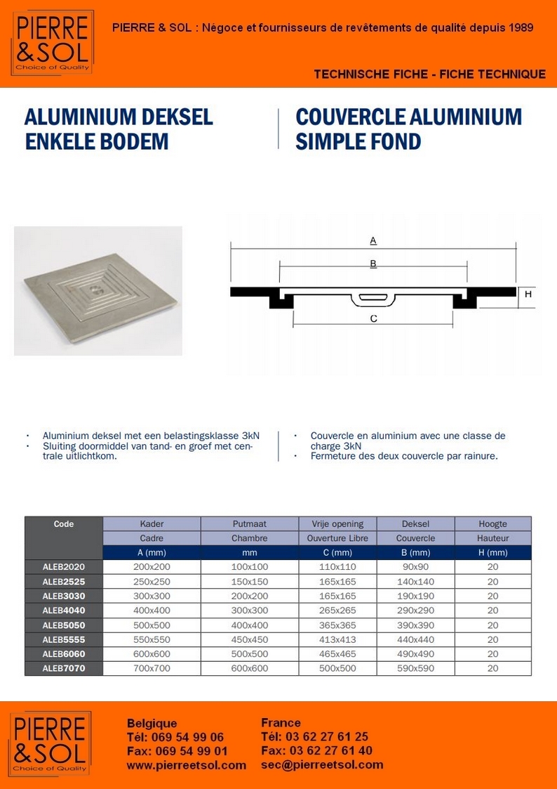 | Coperchio di ispezione in fusione di alluminio a fondo semplice | 30 x 30 cm | 22,90 € | 27,48 € | 26,11 € | 24,73 € | DES ALEB3030 | 5420008700835 | 9 Pièce(s) |