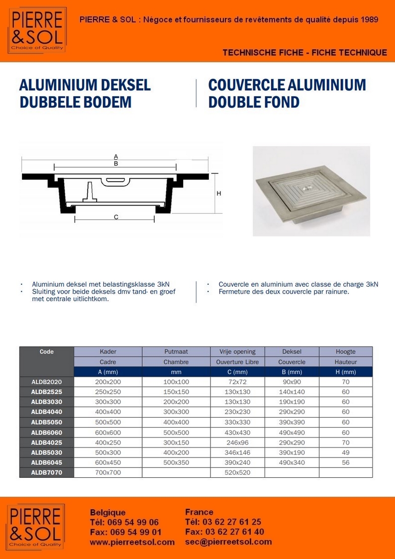 | Coperchio di ispezione in alluminio pressofuso a doppio fondo | 60 x 60 cm | 150,07 € | 150,07 € | 142,57 € | 135,06 € | DES ALDB6060 | 5420008705564 |