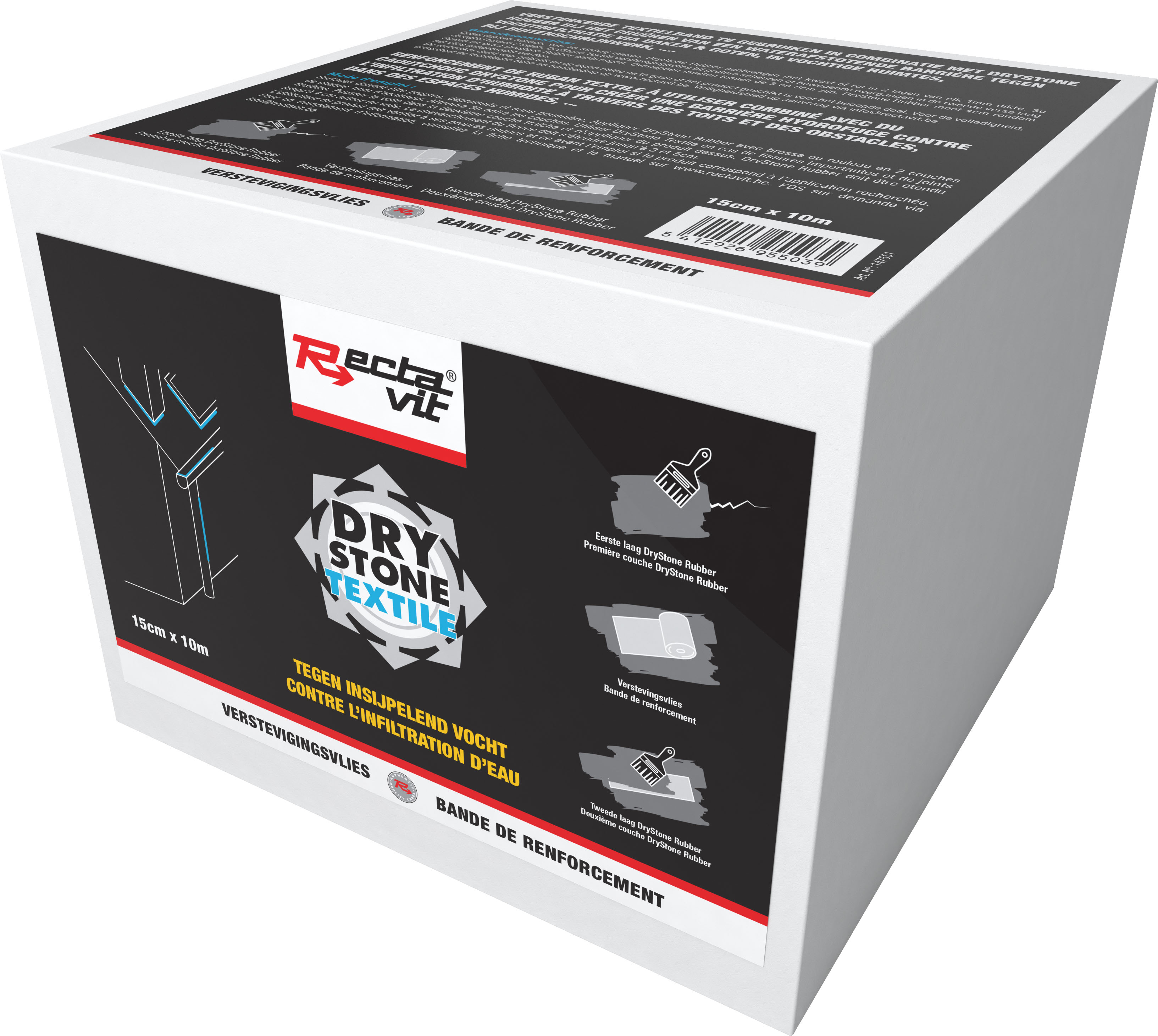 Textiele versterkingstape te gebruiken in combinatie met DryStone Rubber voor scheuroverbrugging , om een waterdichte barrière te creëren tegen waterinfiltratie via dak en goot , bij dakaansluitingen, in vochtige ruimtes, voor buitenschrijnwerk , enz.